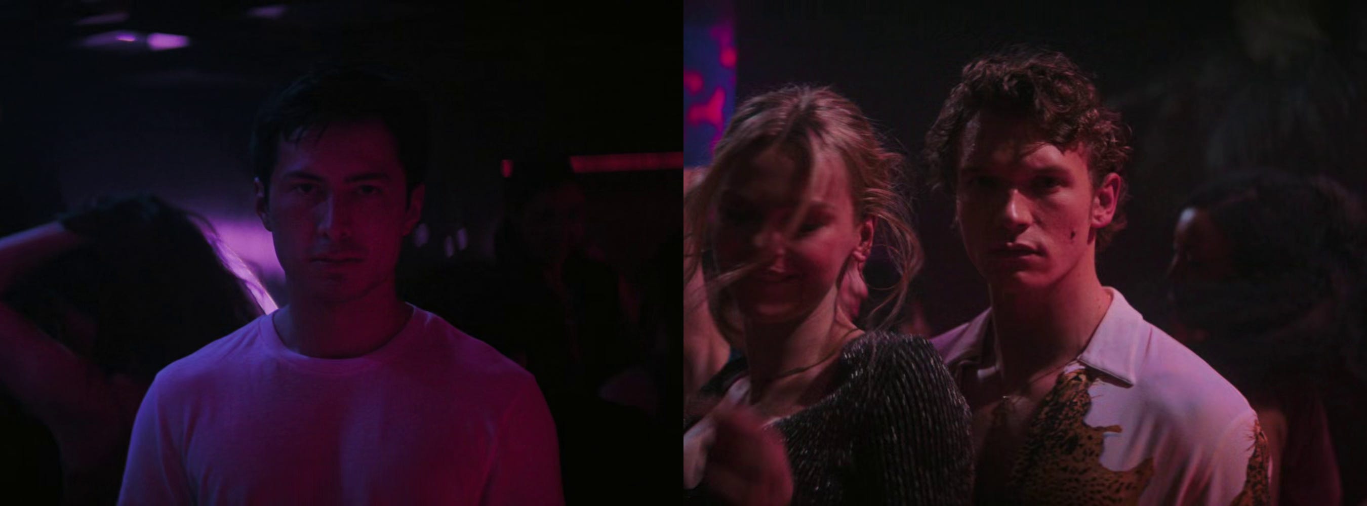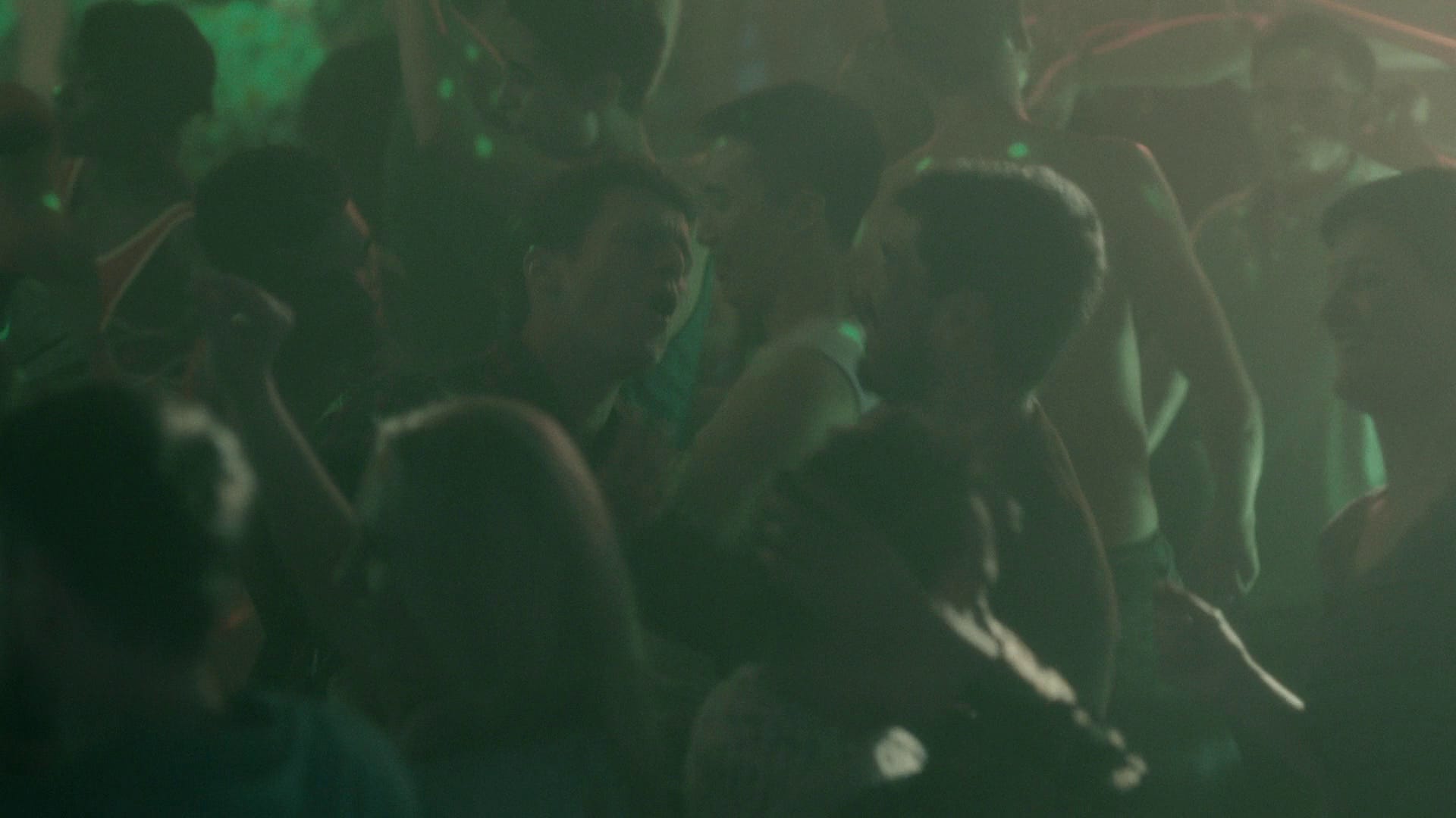 La segunda, es la de la discoteca —icónica—. A ritmo de las t.A.T.u Ilya y Shane se miran en uno al otro, e incluso sus cuerpos se congelan —pasando la escena de la realidad absoluta a cierta ensoñación—. Al mismo tiempo la constante sucesión de planos hacen eterna la distancia física entre los personajes. Contrasta, por ejemplo, con otra escena discotequera en la serie Looking (Michael Lannan, 2014-2016), en el segundo episodio el personaje interpretado por Jonathan Groff y su interés amoroso bailan, esta vez sonando la mejor banda de la historia: Erasure8. A diferencia de la escena de Más que rivales, esta no es una escena de separación, es una primera “cita”, así que no hay necesidad de separarlos, la escena se rueda desde el lateral en un plano fijo, siendo suficiente el movimiento interno del plano, los cuerpos y el baile —no solo de los dos personajes—, para crear ritmo. Al mismo tiempo, los personajes están rodeados de otros sujetos que narrativamente no son relevantes, pero su presencia orgánica imbuye a la escena del disfrute, la diversión, la fiesta queer, y, sobre todo evidencia la existencia de una comunidad que los envuelve y rodea, en vez de aislarles. Este aislamiento en Más que rivales es narrativo, pues su relación es un secreto, además, en esta escena se produce por la congelación literal de los personajes y también por los constantes zoom in, zooms out– hay toda tendencia contemporánea que por alguna razón impide que se usen planos fijos— que los captura únicamente a ellos y los distancia del contexto en el que se encuentran, desenfocando y recluyendo al resto de cuerpos a la irrelevancia de los márgenes de la pantalla.
